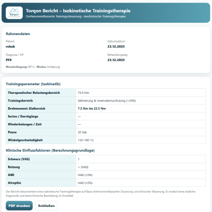 Ergebnis: ein klarer, nachvollziehbarer und dokumentierbarer Vorschlag für die isokinetische Trainingstherapie – inklusive Trainingsempfehlung sowie Bericht- und PDF-Ausgabe
